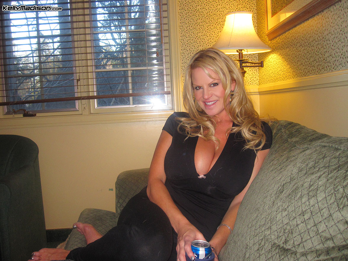 Big breasted blonde slut Kelly Madison takes off her white bra and shows her jugs.