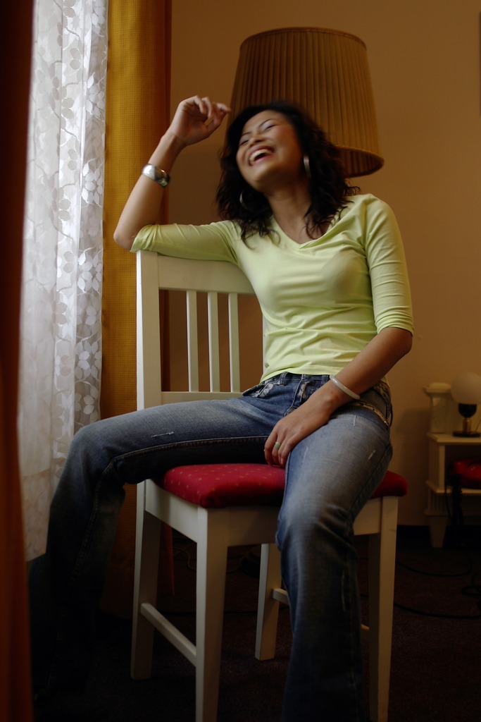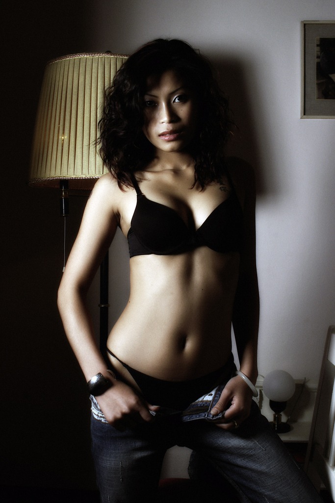 Alluring black chick Kimi strips her blue jeans and shows her amazing tight ass.