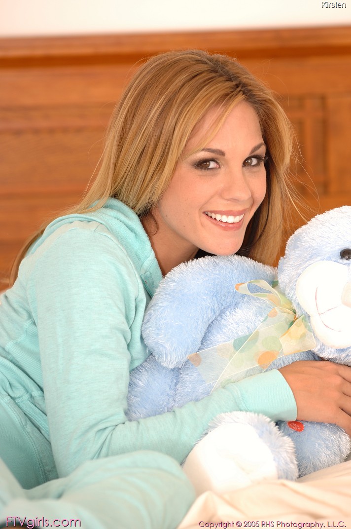 Sexy solo babe, Kirsten Price posing in her bed, getting naked and showing her tits.