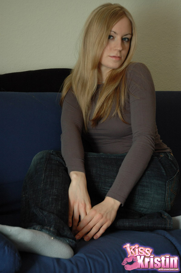 Hot blonde babe Kiss Kristin takes off her top and shows her bouncy breasts.