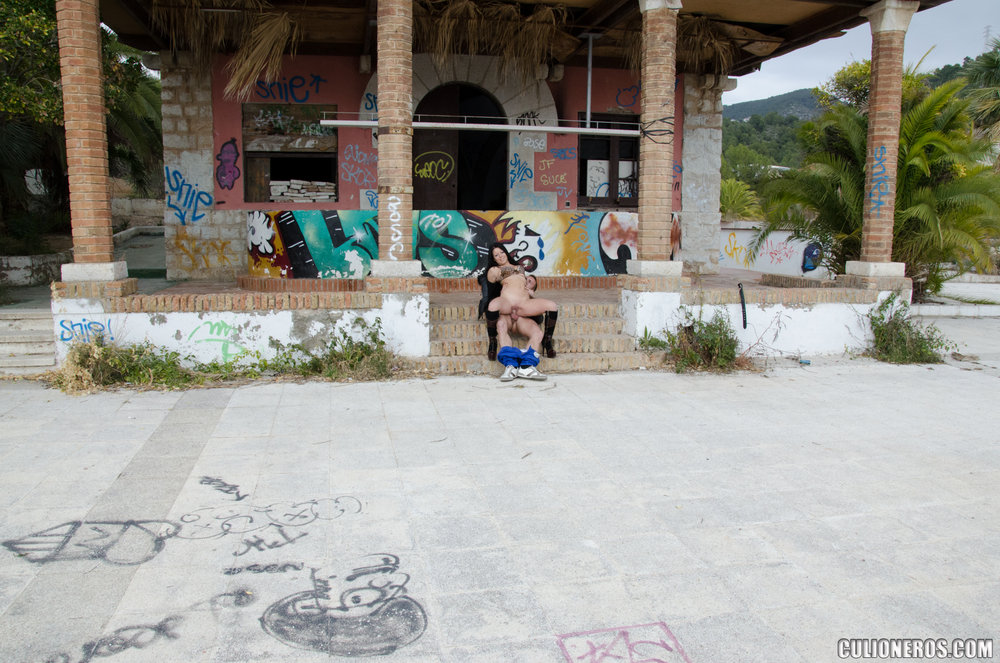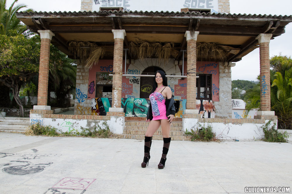 Horny madam having dark hair and wearing high heels is getting penetrated in the street