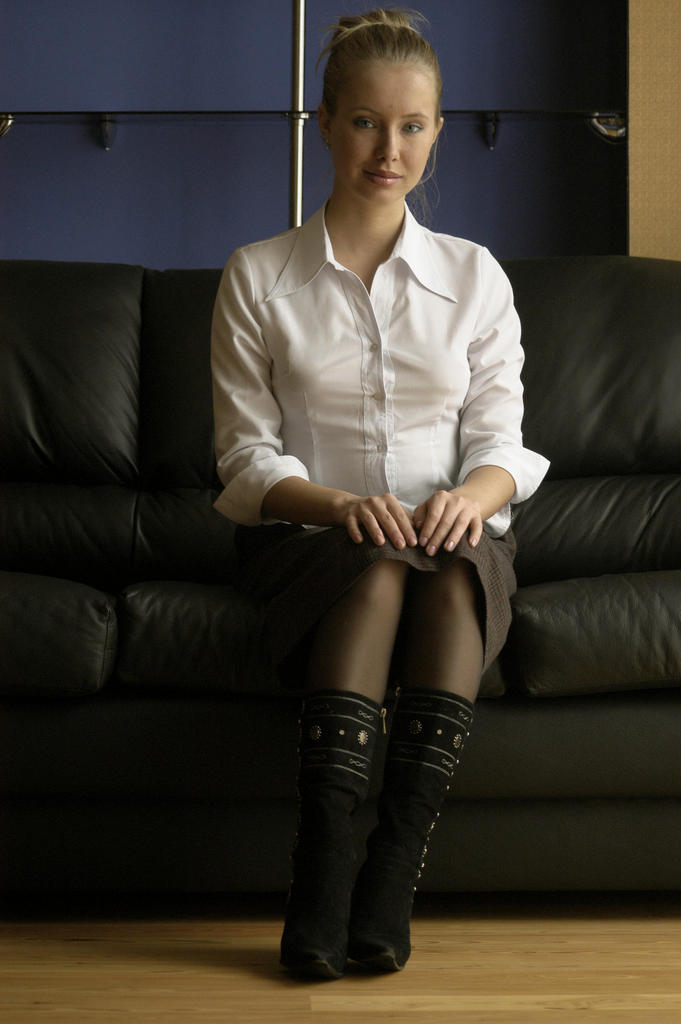 Koika takes her clothes on the sofa and teases us in sexy black nylon stockings.