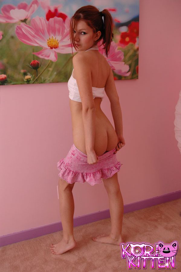 Lusty redhead teen hottie Kori Kitten takes off her mini skirt and shows her booty.