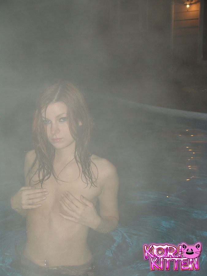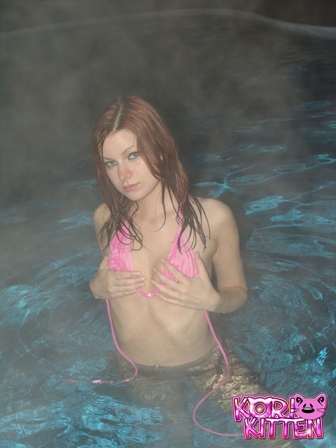 Good looking redhead teen Kori Kitten strips in the pool and shows her rack.