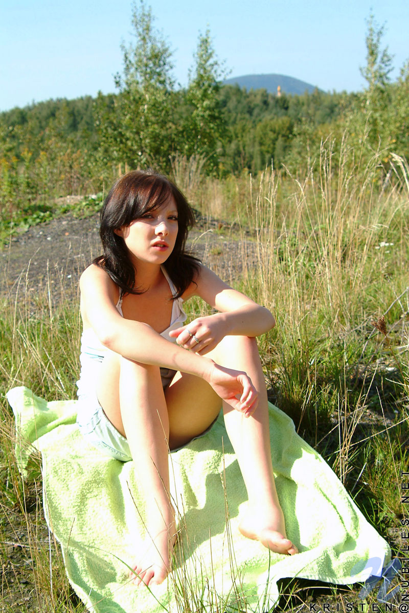 Kristen Nubiles takes her sexy summer dress outdoors on the field and shows off.