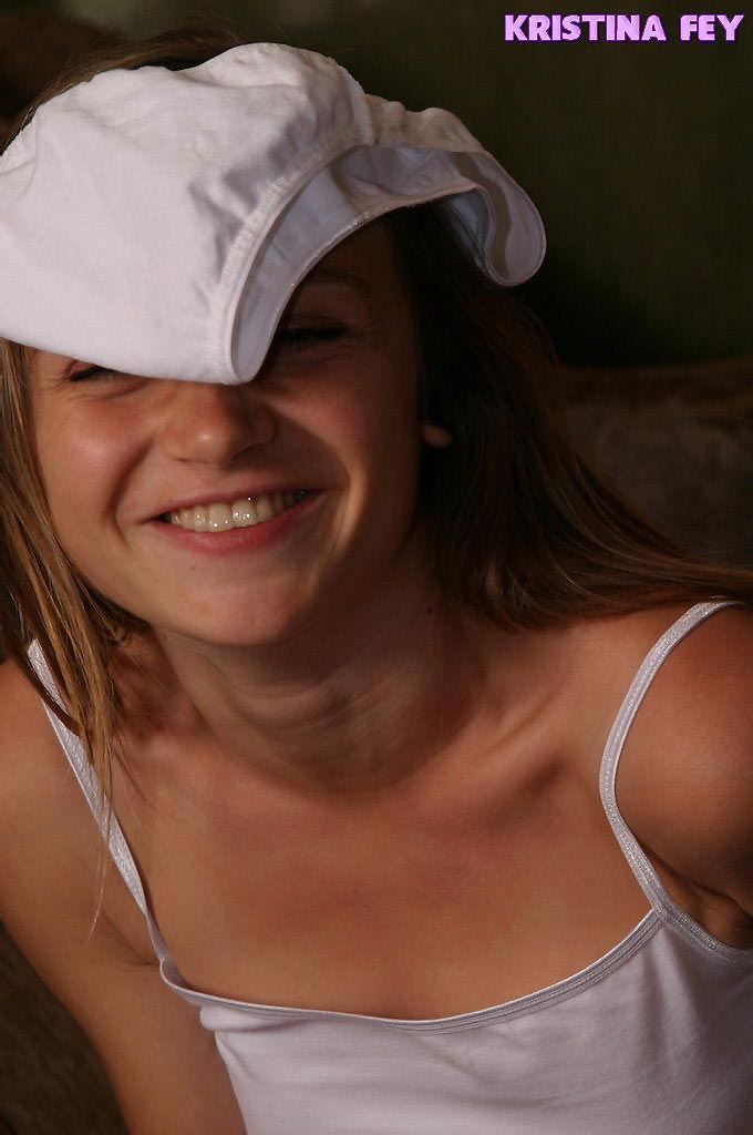 Hot blonde teen Kristina Fey takes off her white lingerie and shows her tight ass.