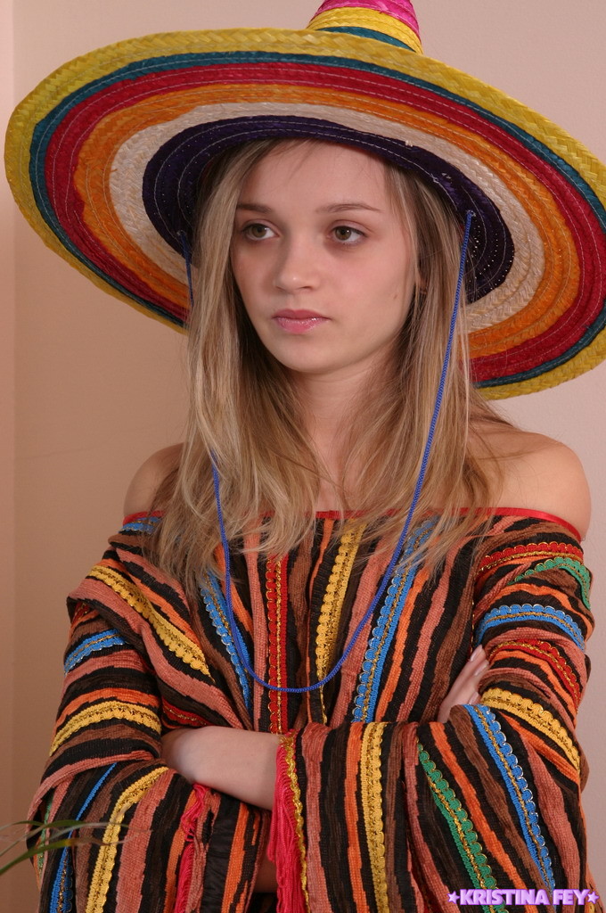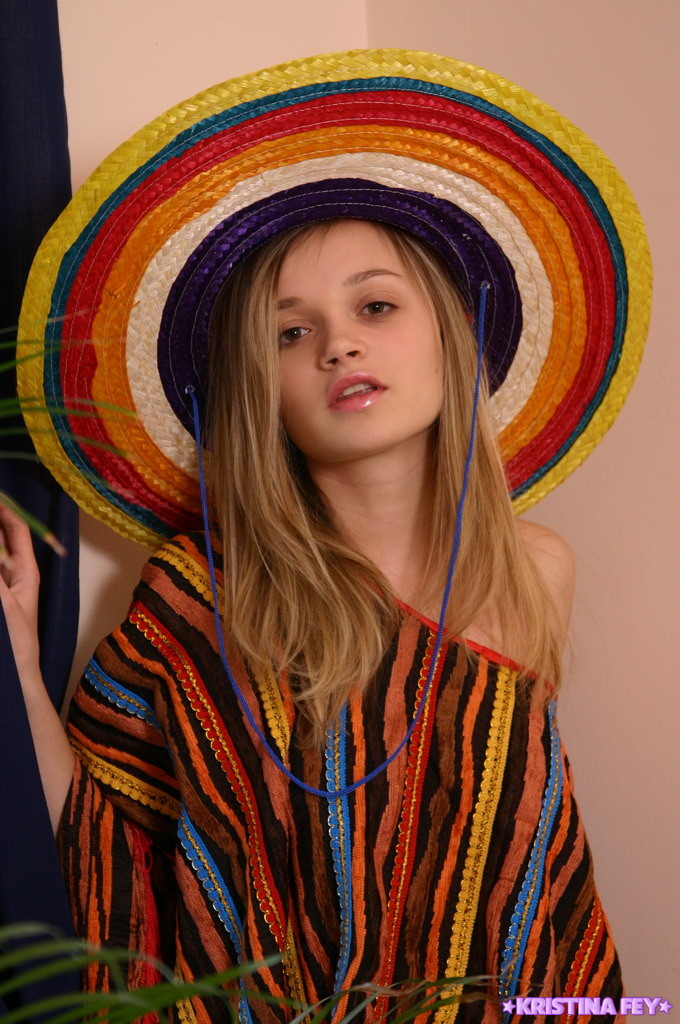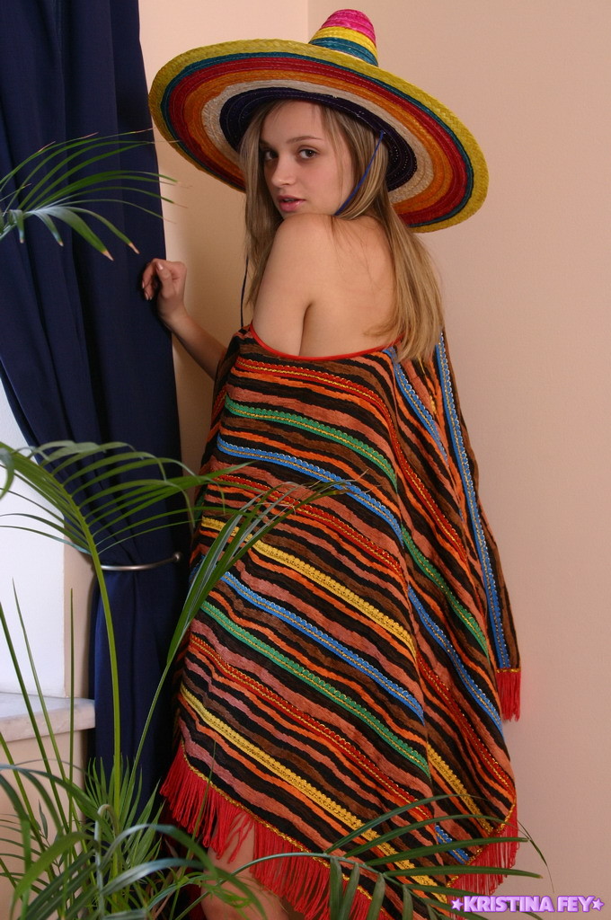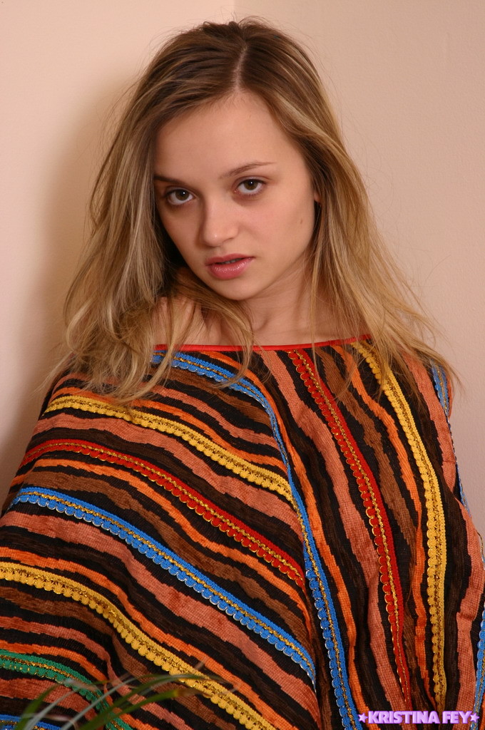Hot teen gal Kristina Fey takes off her poncho and shows us her round breasts.