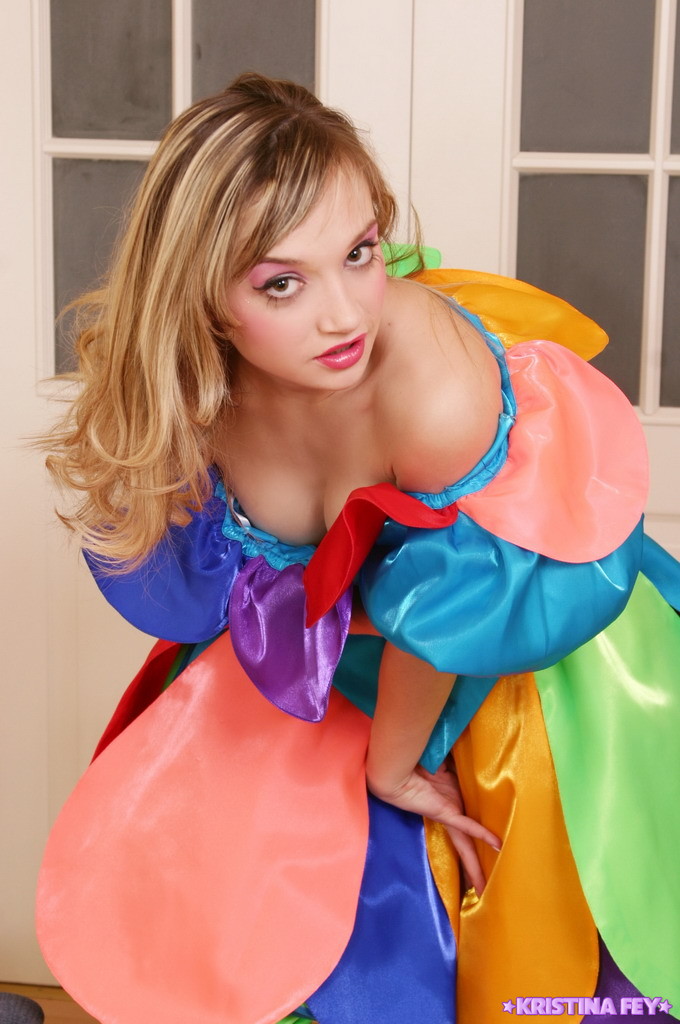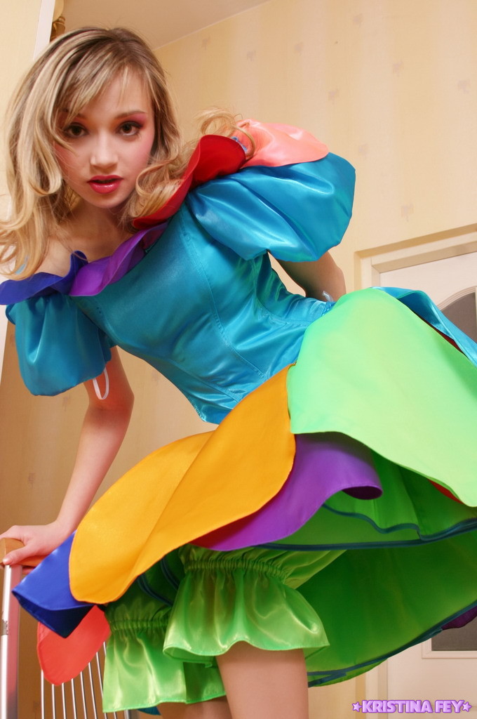 Beautiful blonde model Kristina Fey takes off her colorful dress and shows her boobs.