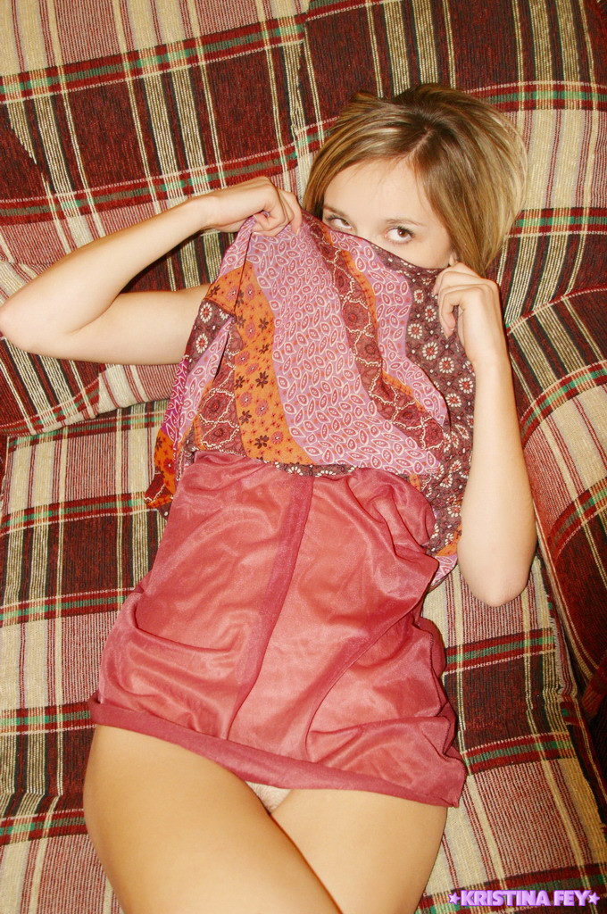 Horny teen Kristina Fey takes off her clothes on the sofa and shows her trimmed cunt.