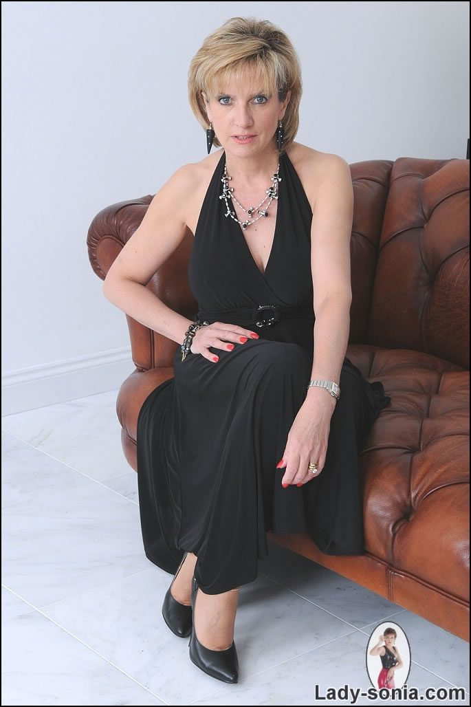 Lady Sonia removes her clothes on the sofa and then fingers her hungry shaved muff.