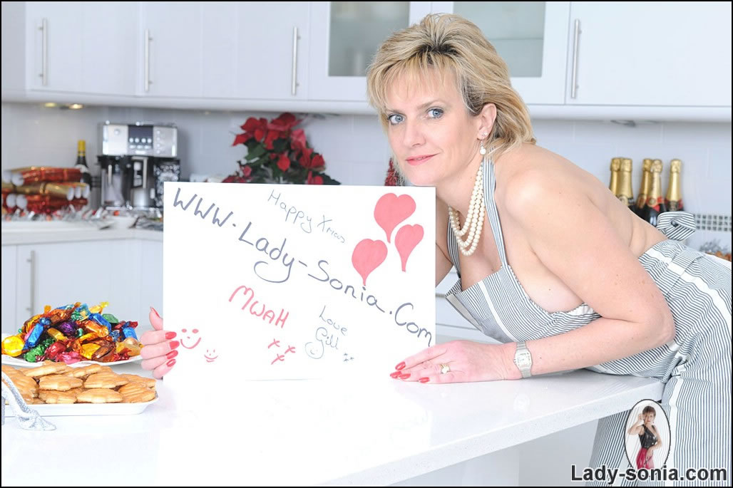 Lady Sonia strips her elegnat outfit in the kitchen and teases us in stockings.