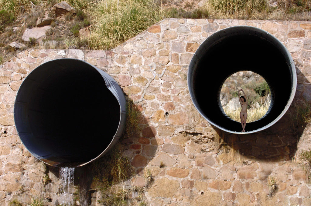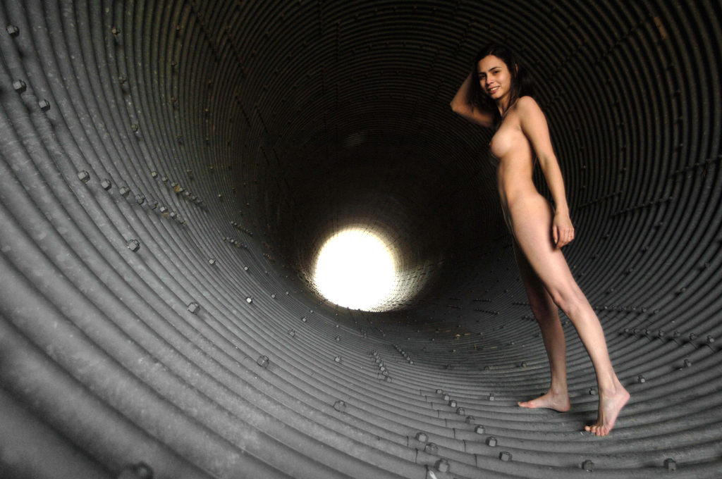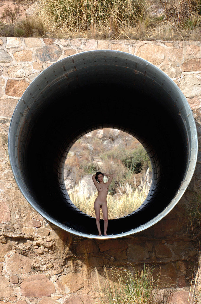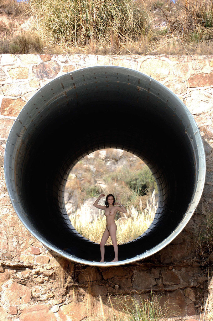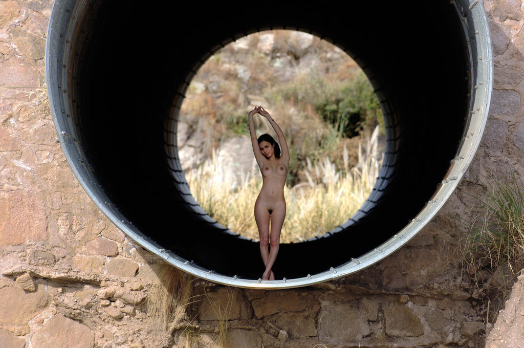 Alluring brunette model Lara MetArt strips outdoors and shows us her round boobs.