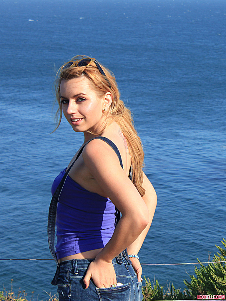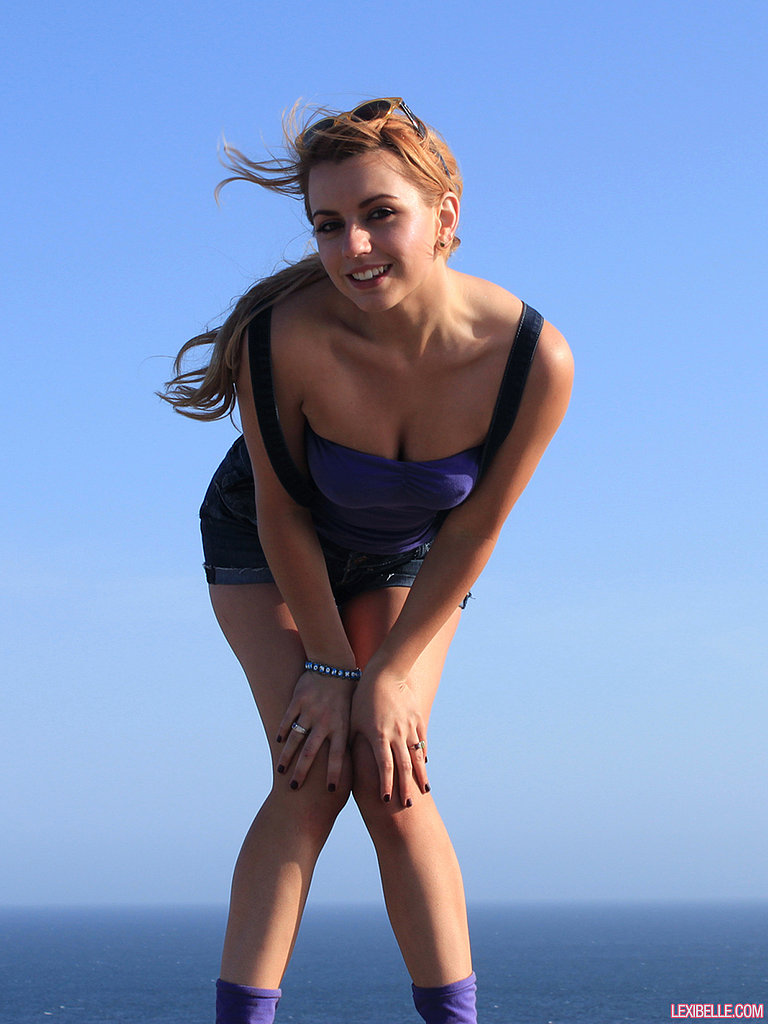 Handsome brunette Lexi Belle taking shorts off and exposing tight booty outdoor.