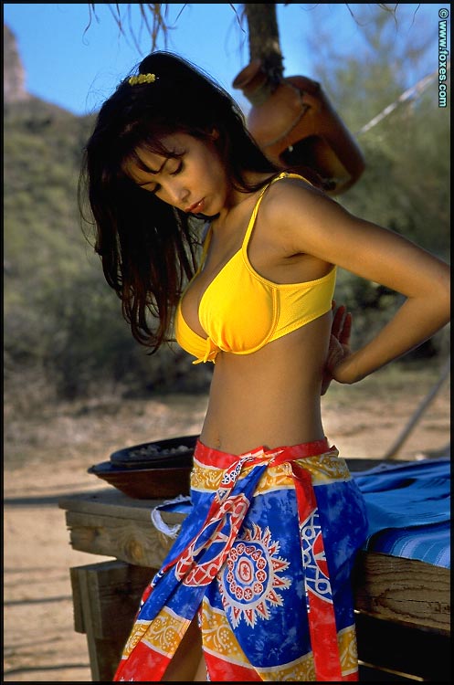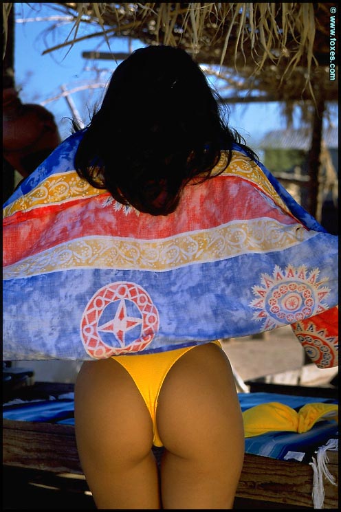 Dark haired hottie in a yellow bra wants to display her perfect body on the beach, she's so hot!