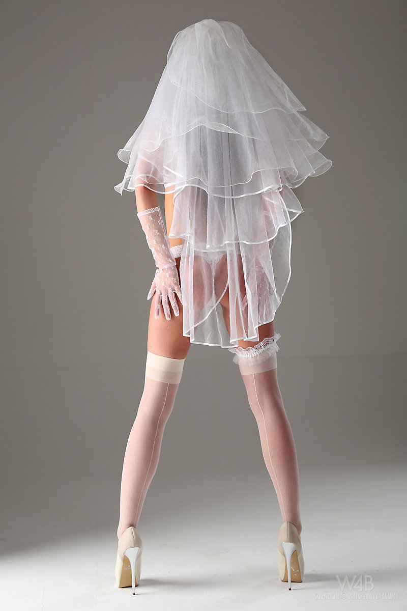 Licentious queen in sparkling wedding gown undressing and flaunting her superb tits before wanking