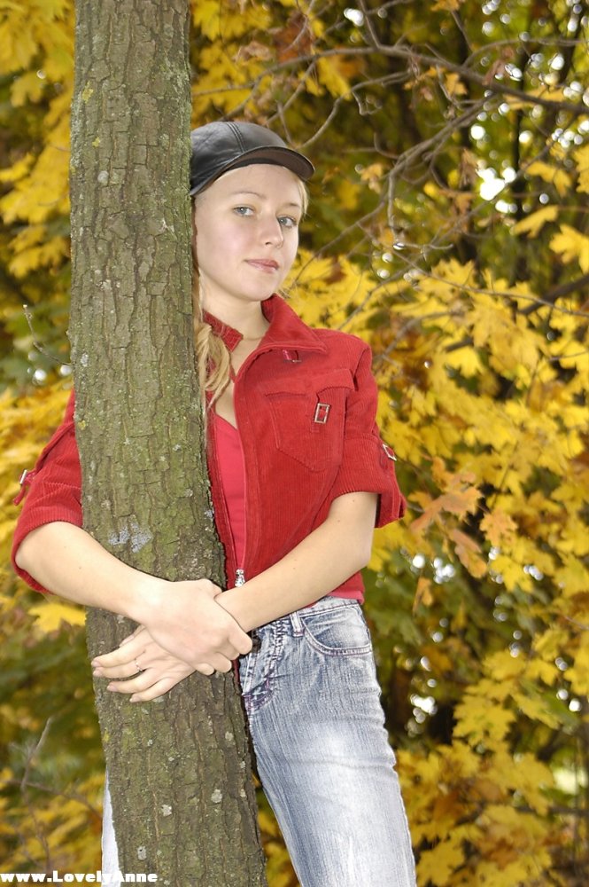 Cute pigtailed blonde Lovely Anne takes off her blue jeans and shows her tight ass.