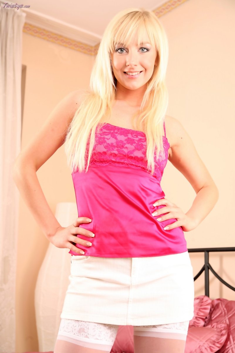 Foxy blonde gal Lucy Nova strips her mini skirt and teases us in stockings.