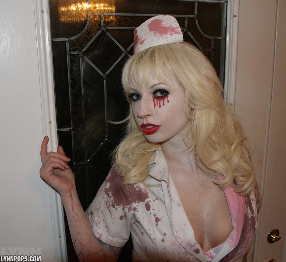 Hot blonde slut Lynn Pops strips her lingerie and shows her perky round boobs.