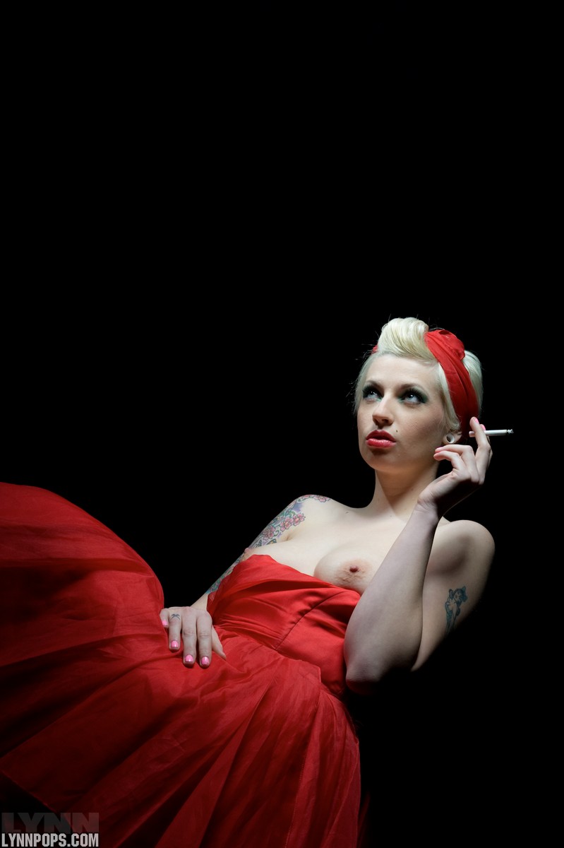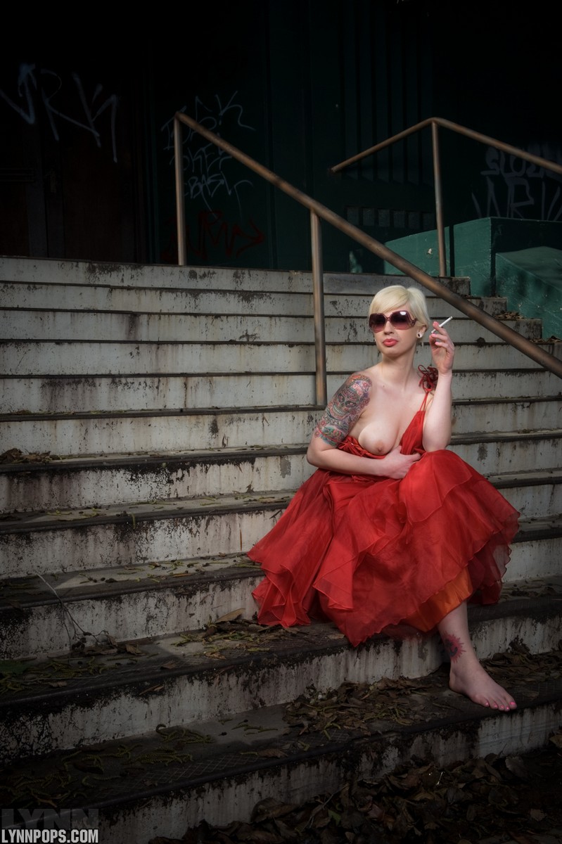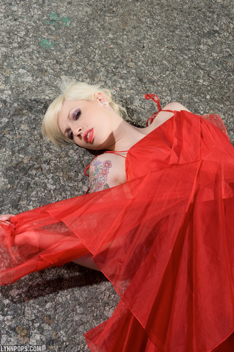 Hot blonde lady Lynn Pops strips her red dress and shows us her beautiful jugs.