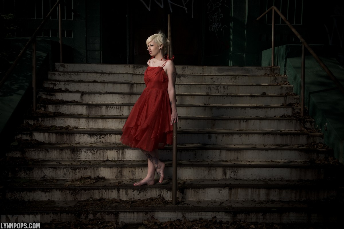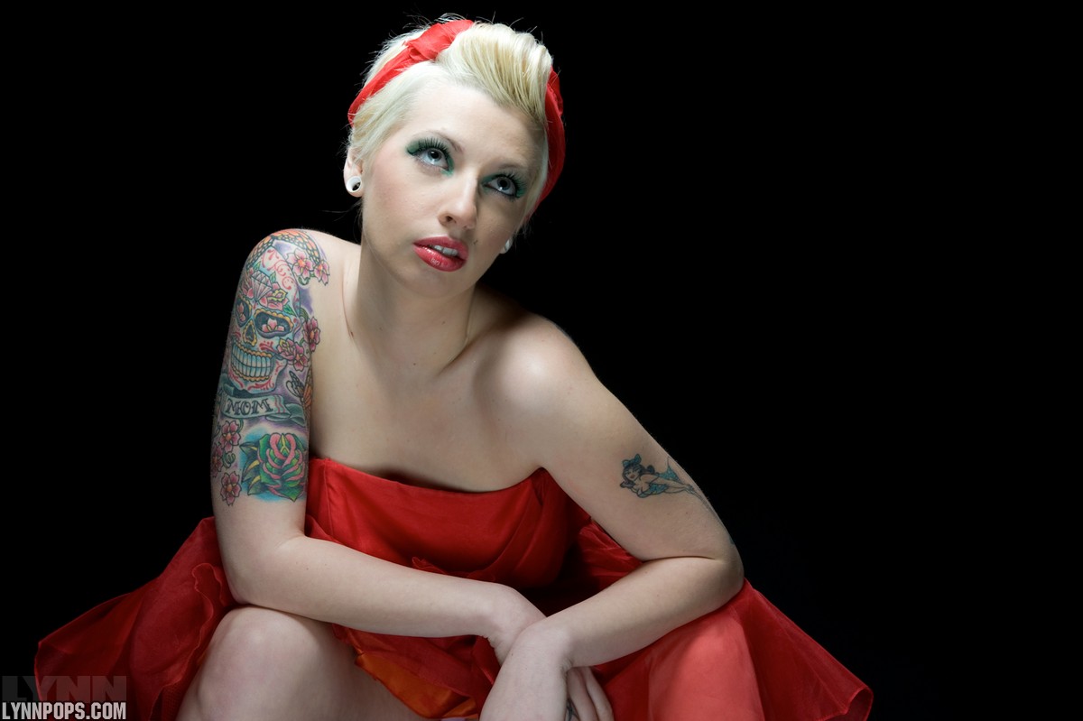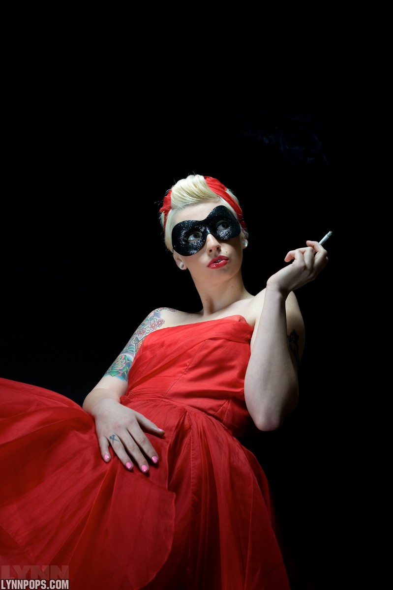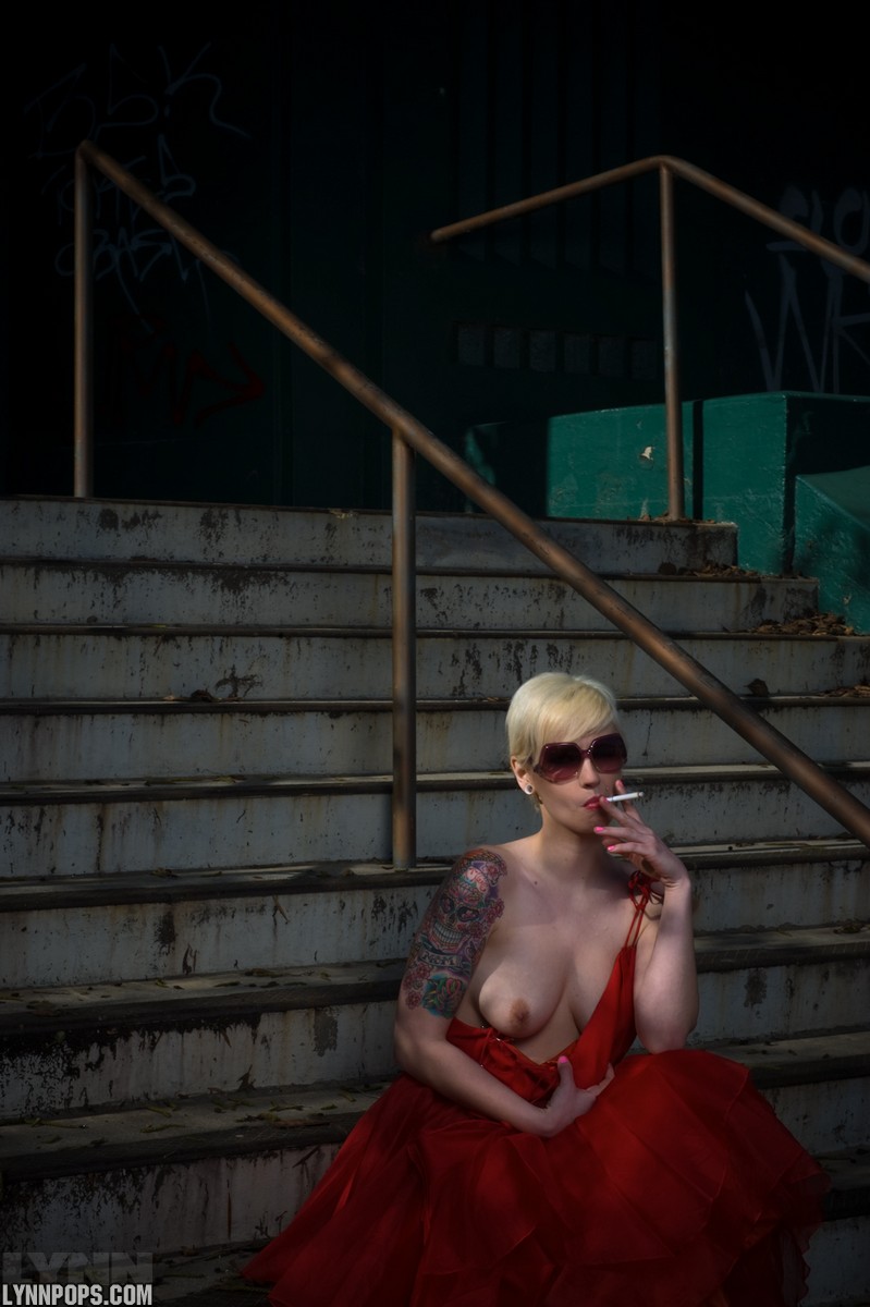 Hot blonde lady Lynn Pops strips her red dress and shows us her beautiful jugs.