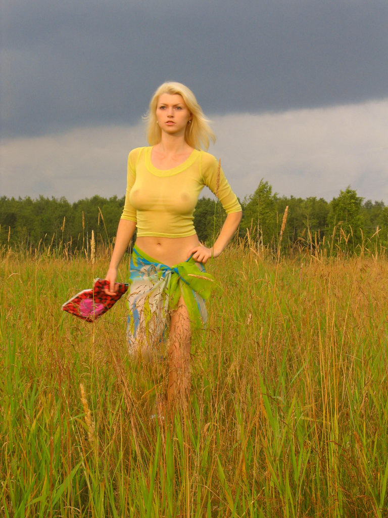Maria D takes here clothes off on the field outdoors and shows her breasts.