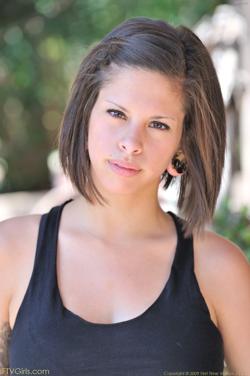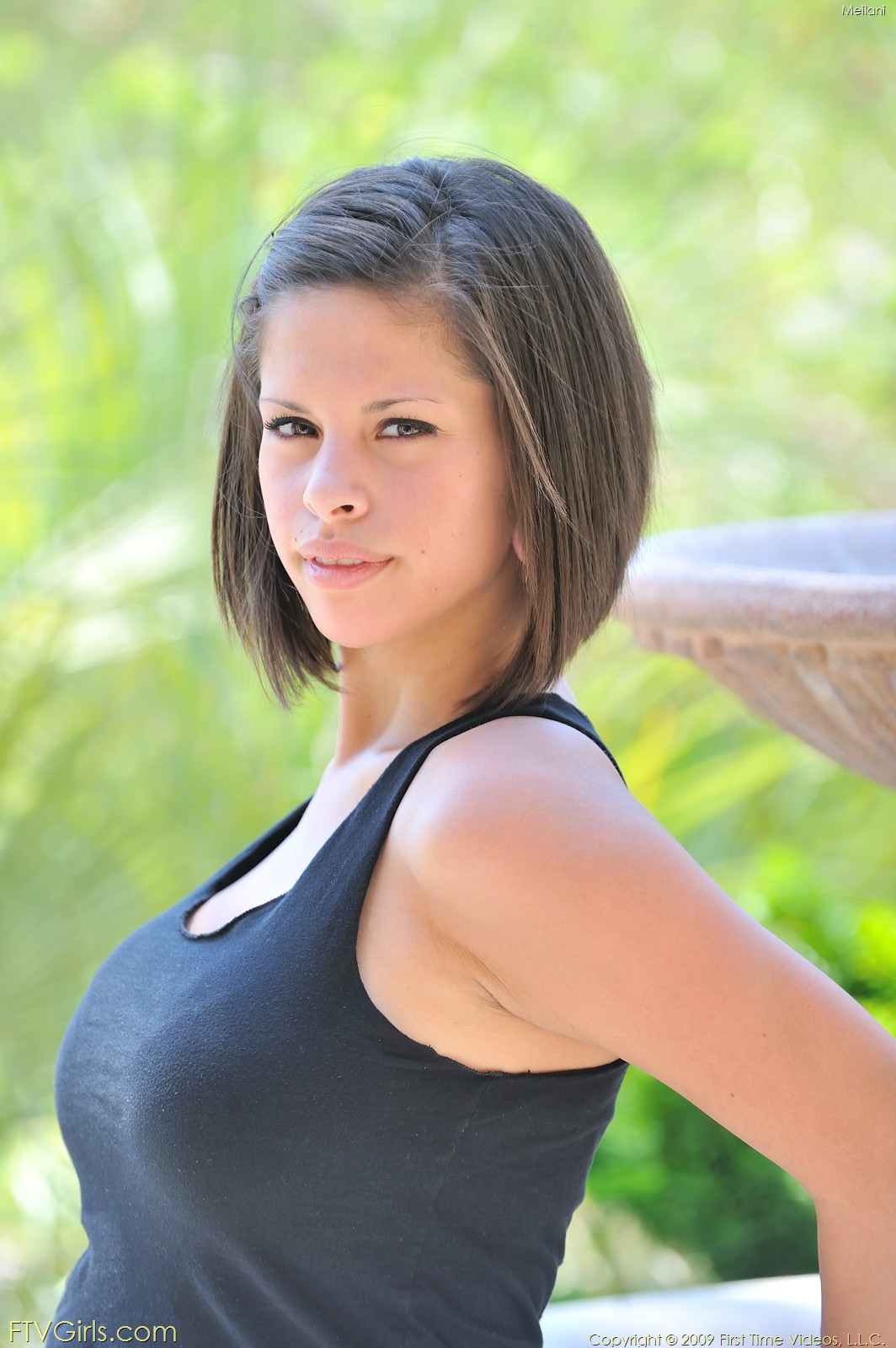 Busty and sexy teen babe Meilani FTV strips her blue shorts and black thongs.