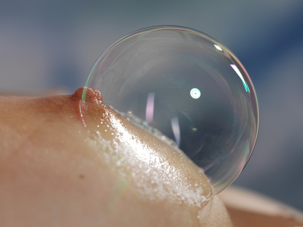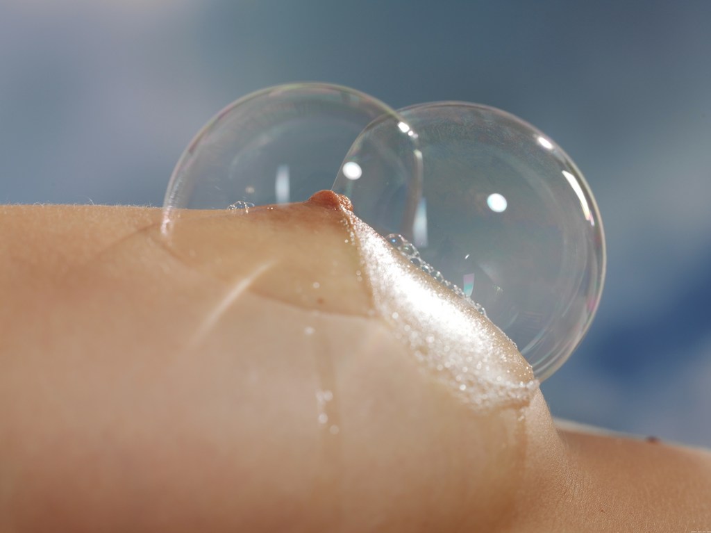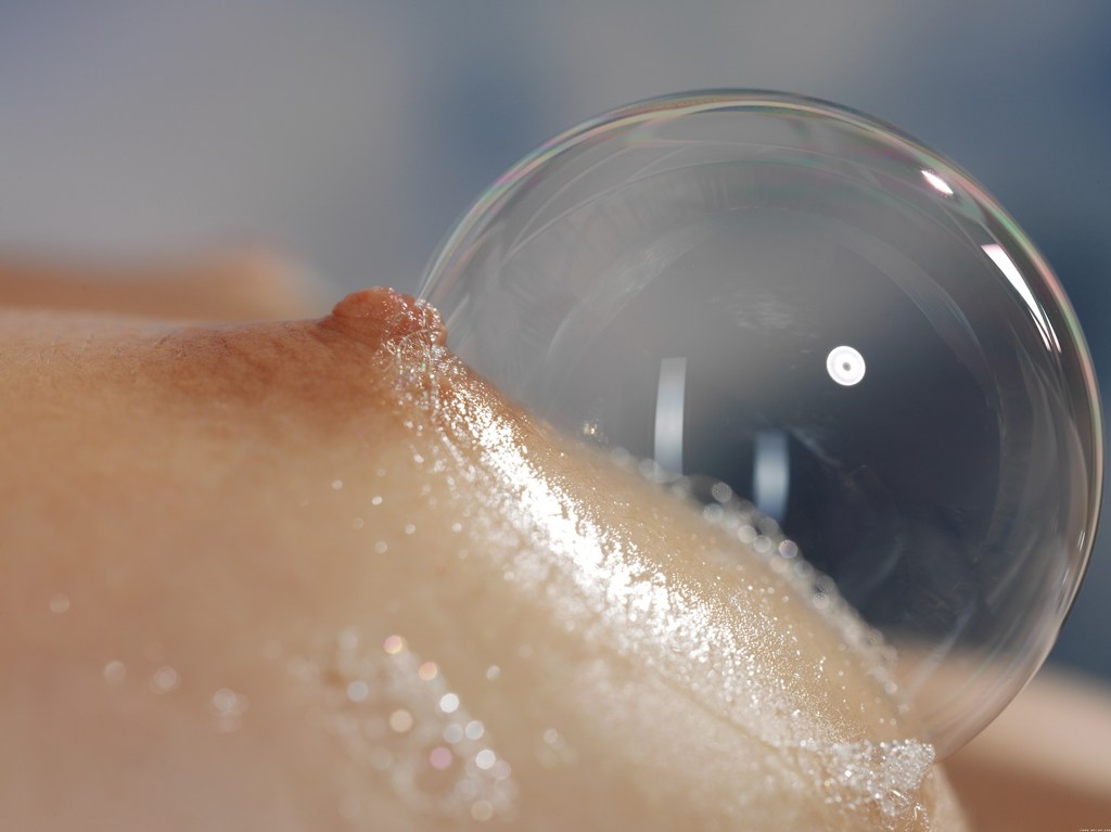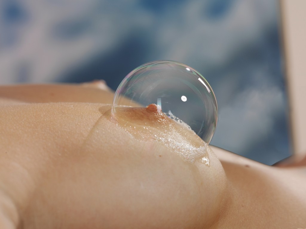 Mila Ieye takes her sexy red lingerie off and blows bubbles from her shaved cunt.