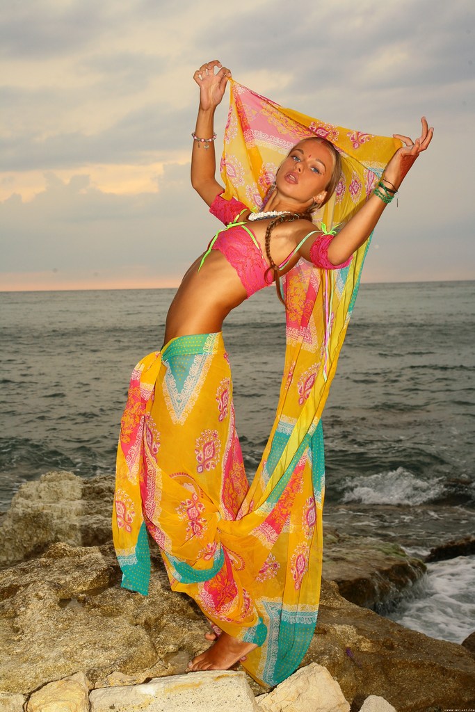 Milena D takes her sexy bikini off by the ocean and shows her perky breasts.