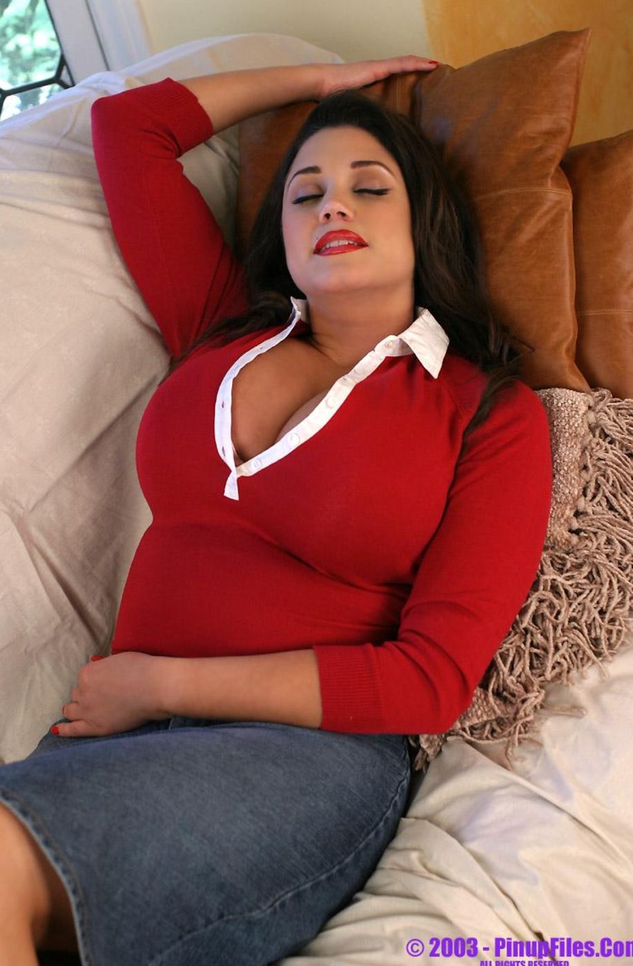 Sexy brunette momma Miriam Gonzalez with her huge melons posing in red t-shirt.