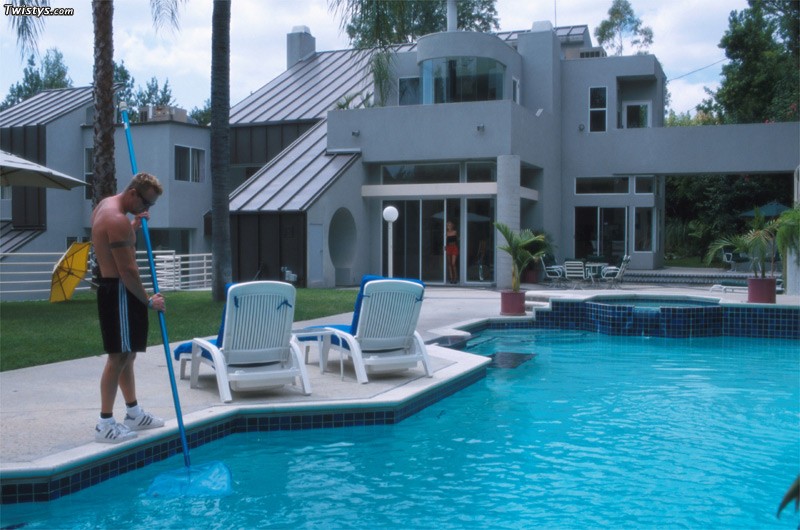 Hot blonde babe Molina strips by the pool and blows a hard throbbing johnson.