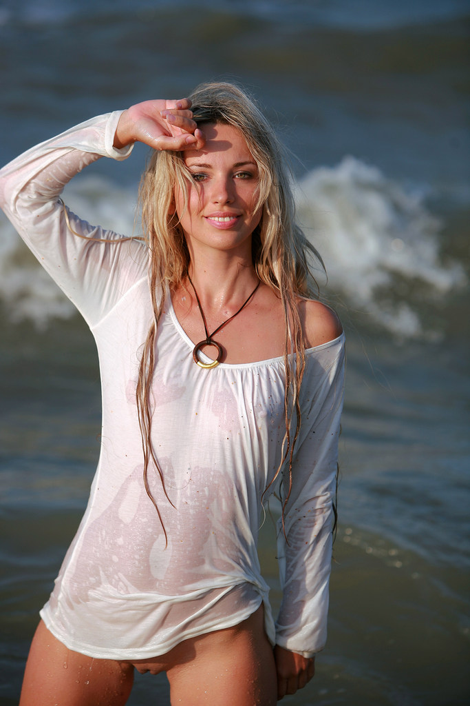 Natalia B takes her wet see through shirt off and shows us her tight booty.