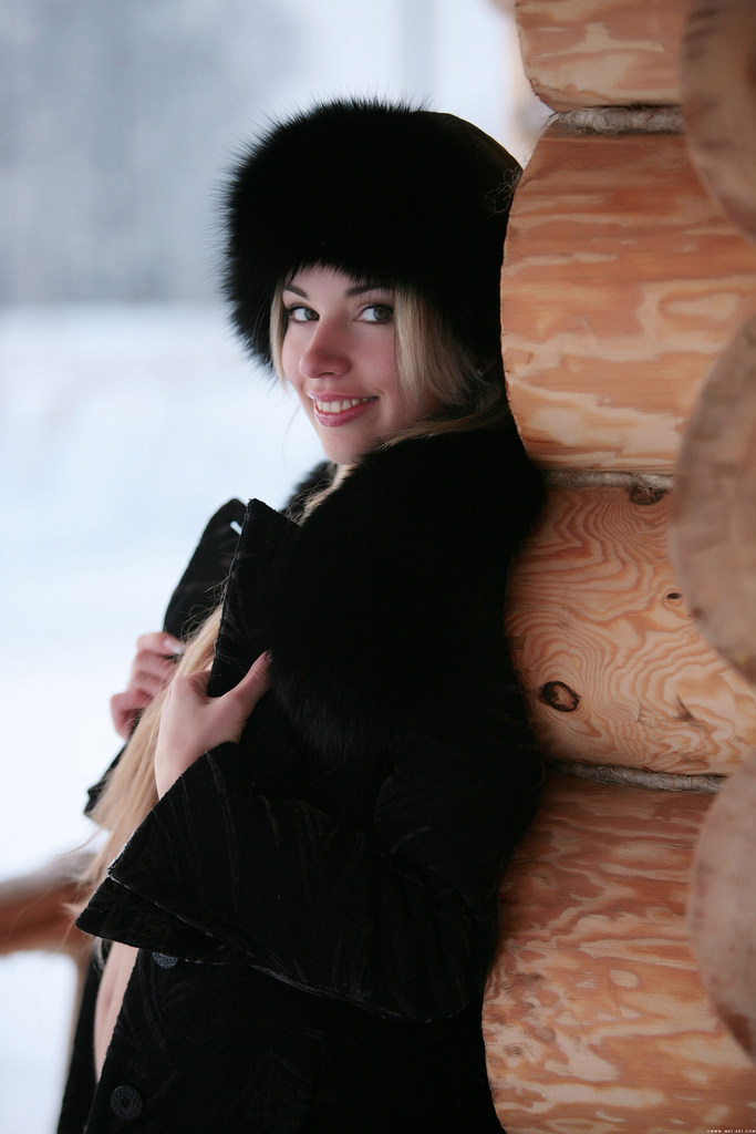 Natalia B takes her fur coat outdoors and teases us with her perky breasts.