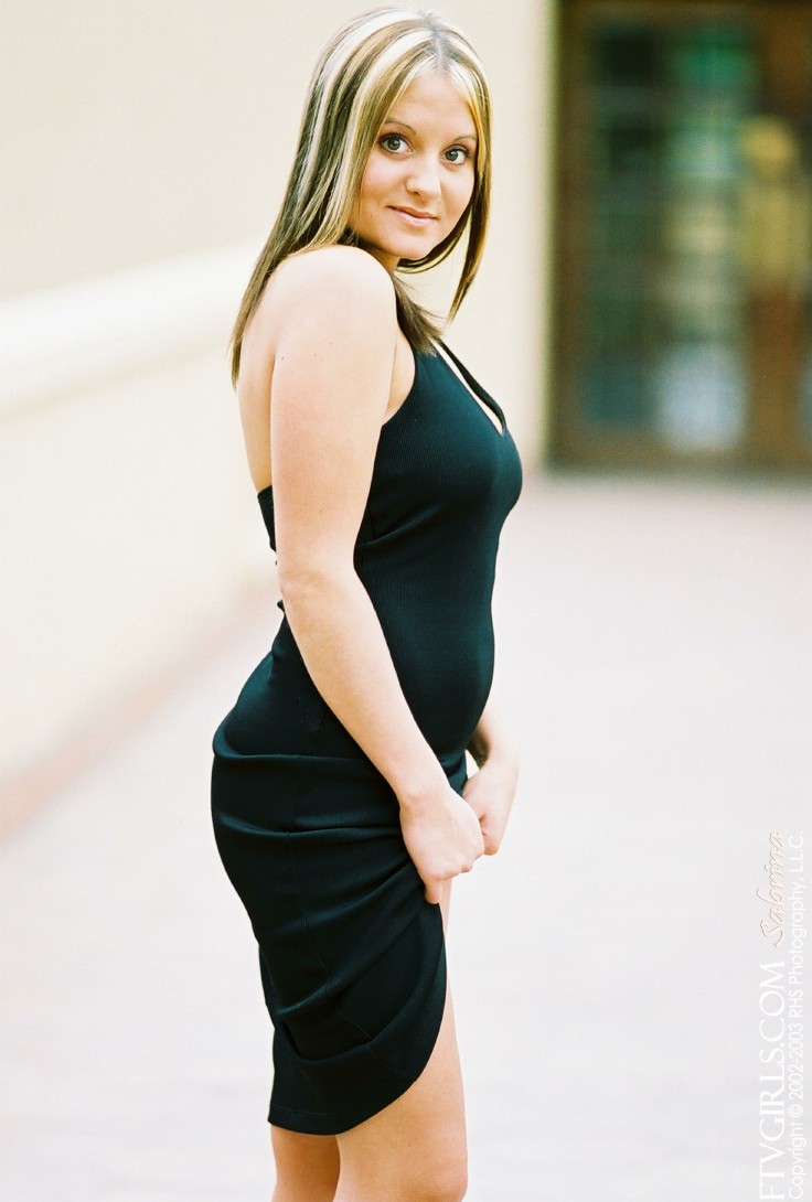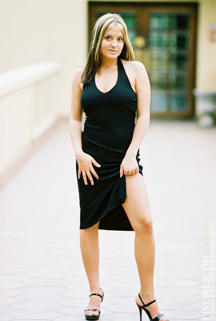 Sexy solo babe, Nicole Parks posing in her sexy black dress and shows her pussy.