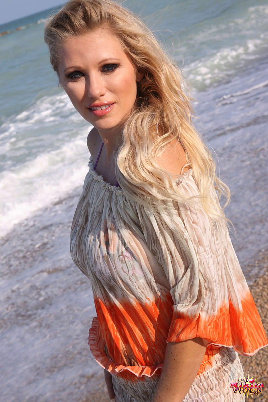 Beautiful blonde model Nikita Valentin strips on the beach and shows her big jugs.