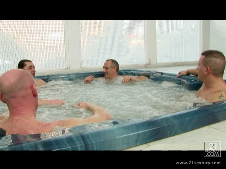 Tempting blonde beauty jumps into a Jacuzzi filled with perverts who can't wait for blowjobs.
