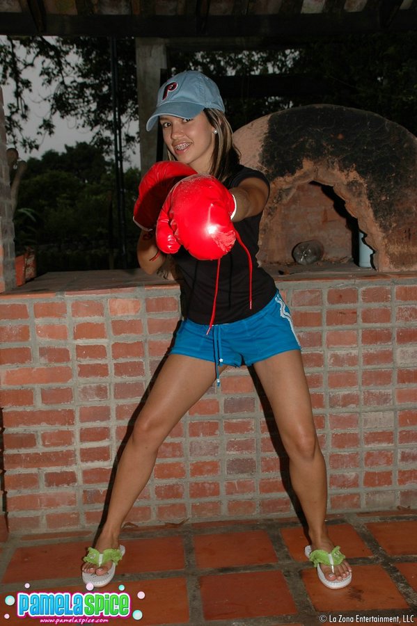 Sporty tanned brunette hottie Pamela Spice stripping shorts and showing shaved pussy.
