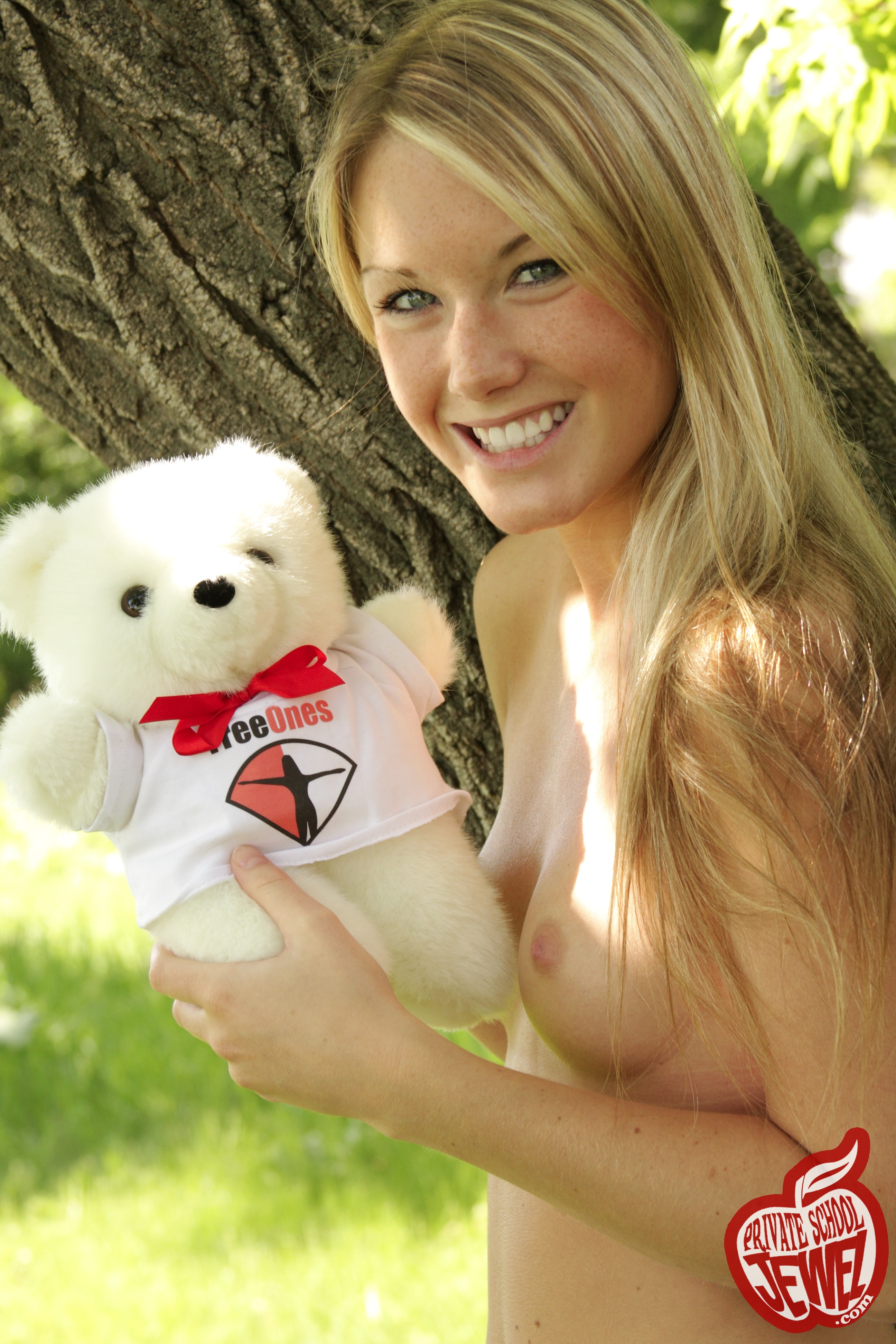 Private Jewel posing in FreeOnes outfit outdoors in the park and hugging a teddy bear.