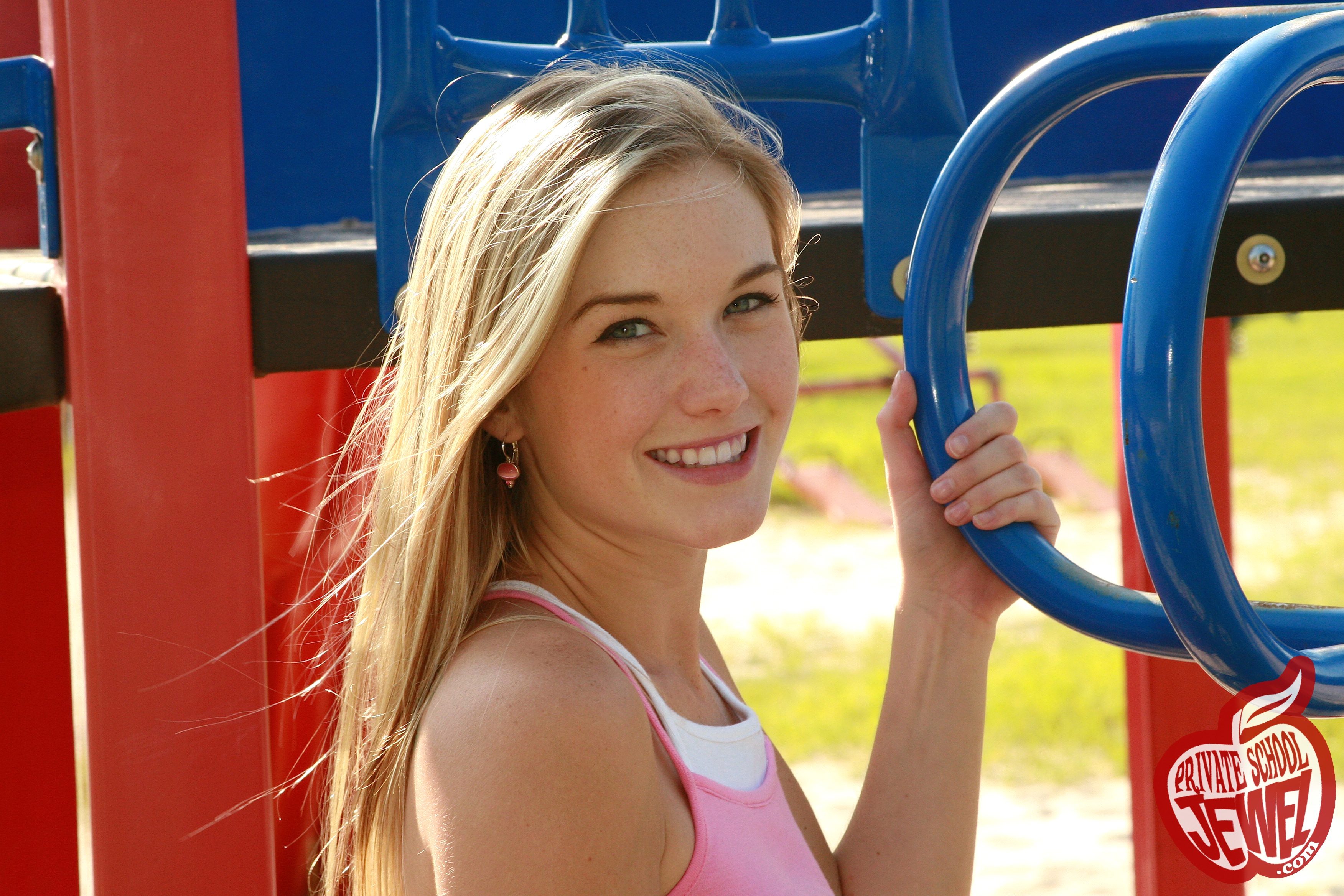 Innocent hottie Private Jewel playing naughty at the playground showing landing strip.