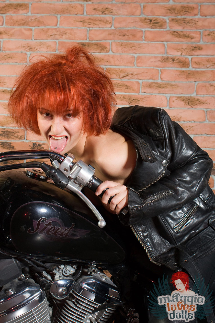 Wild redhead babe Red Maggie poses on the motorbike completely naked and horny.