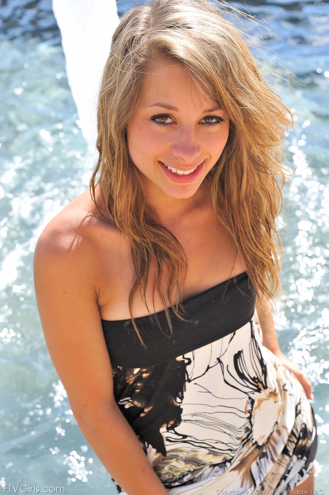 Cute Riley Jensen drops down her sexy dress and shows her beautiful naked body.