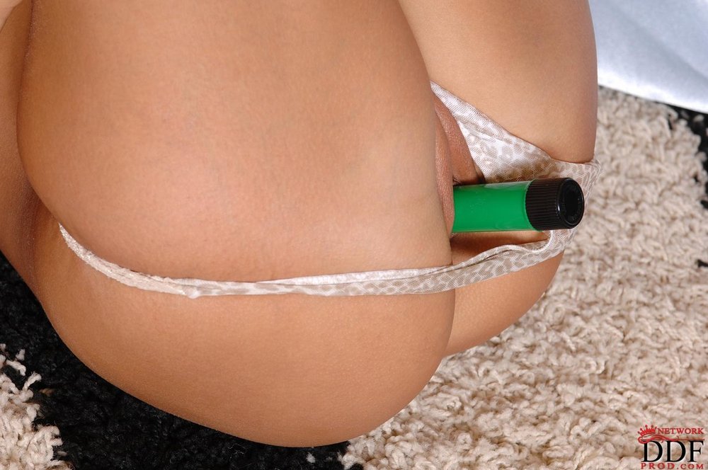 Busty tanned Satin Bloom wearing lace undies sticking dildo up her shaved twat.