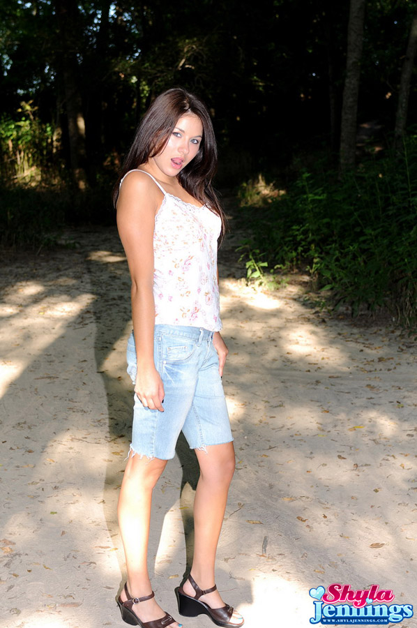 Seductive teen hottie Shyla Jennings strips in the woods and plays with her hot twat.