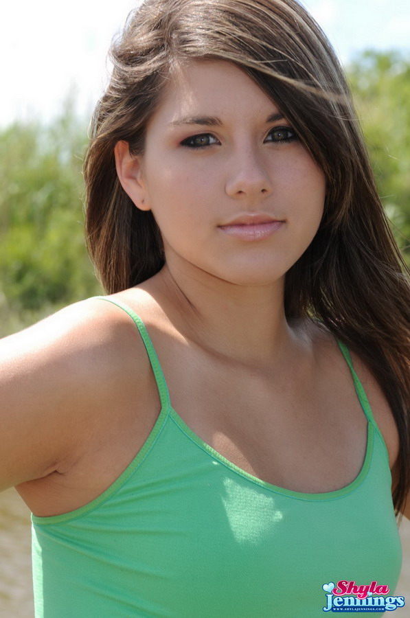 Passionate and seductive teen gal Shyla Jennings takes off her top and shows her tits.