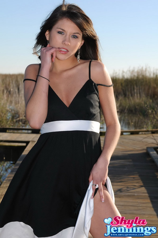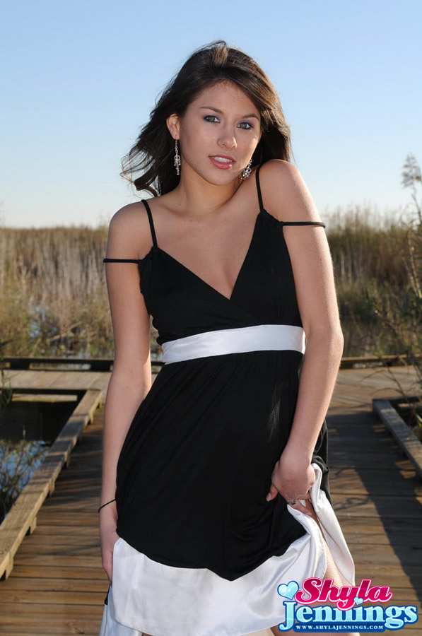 Small breasted teen cuttie Shyla Jennings takes off her black dress and shows her ass.