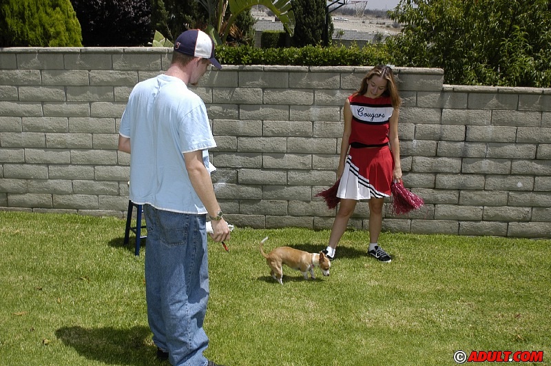 Smokie Flame takes her slutty cheeleader outfit outdoors and gets rammed hard.