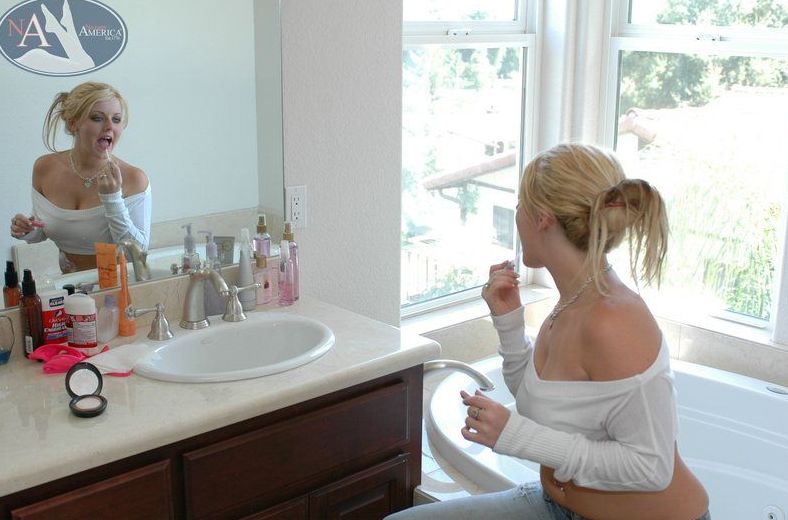 Nasty blonde Sophie Dee with great titties getting fucked by black cock in bathroom.