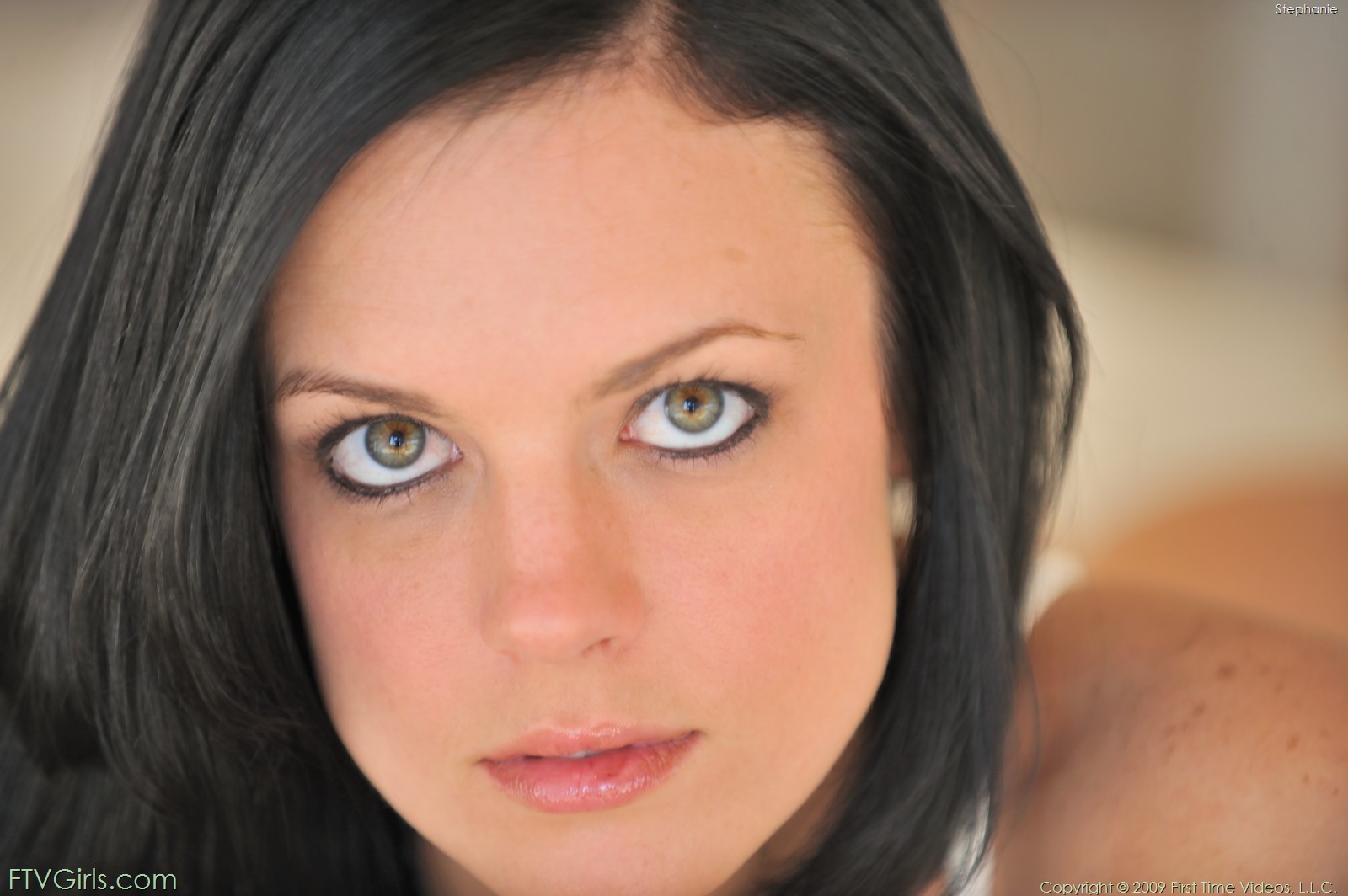 Brunette Stephanie Sage with great body wearing white lace lingerie exposing twat.