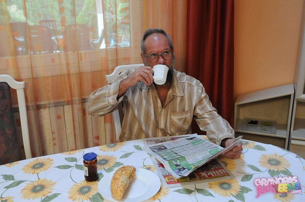 Adorable blondie loves older men, in this scene she seduces a bearded guy and fucks his brains out