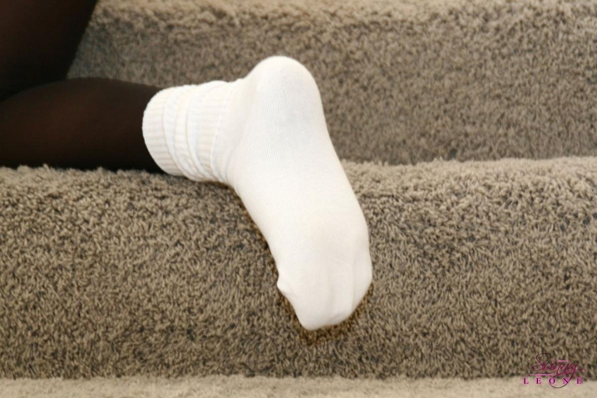 Sunny Leone takes her sexy black pantyhose off and fingers her hungry wet vagina.