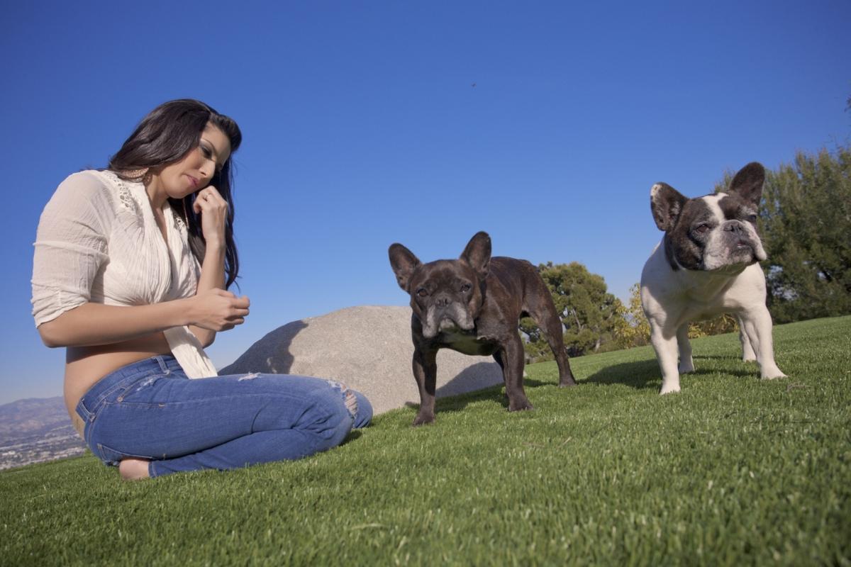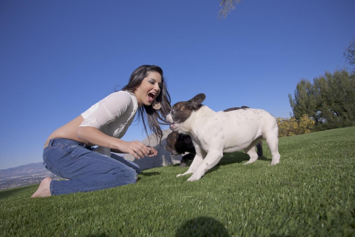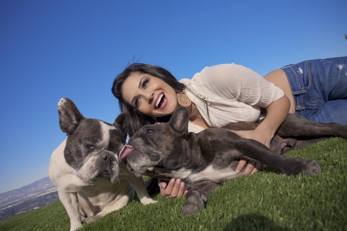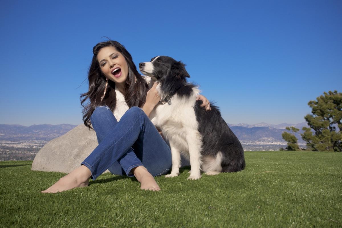 Sexy Sunny Leone plays with her dogs outside before starting off a steamy striptease.